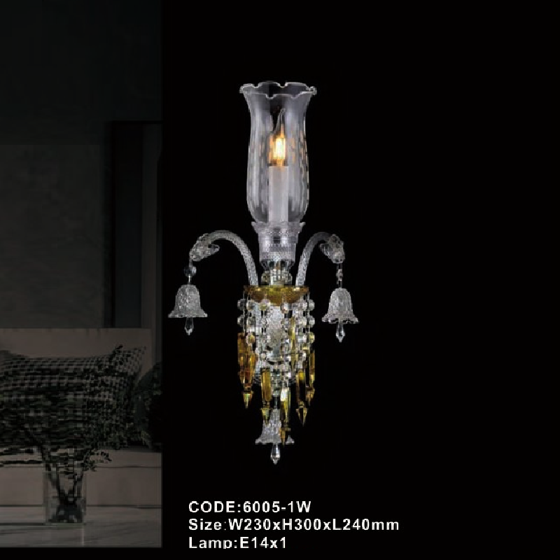 CODE: 6005 - 1W: Đèn gắn tường Phale nến 1 bóng chao thủy tinh - KT: L240mm x W230mm x H300mm - Đèn LED 1 W + Bóng đèn E14 x 1 bóng