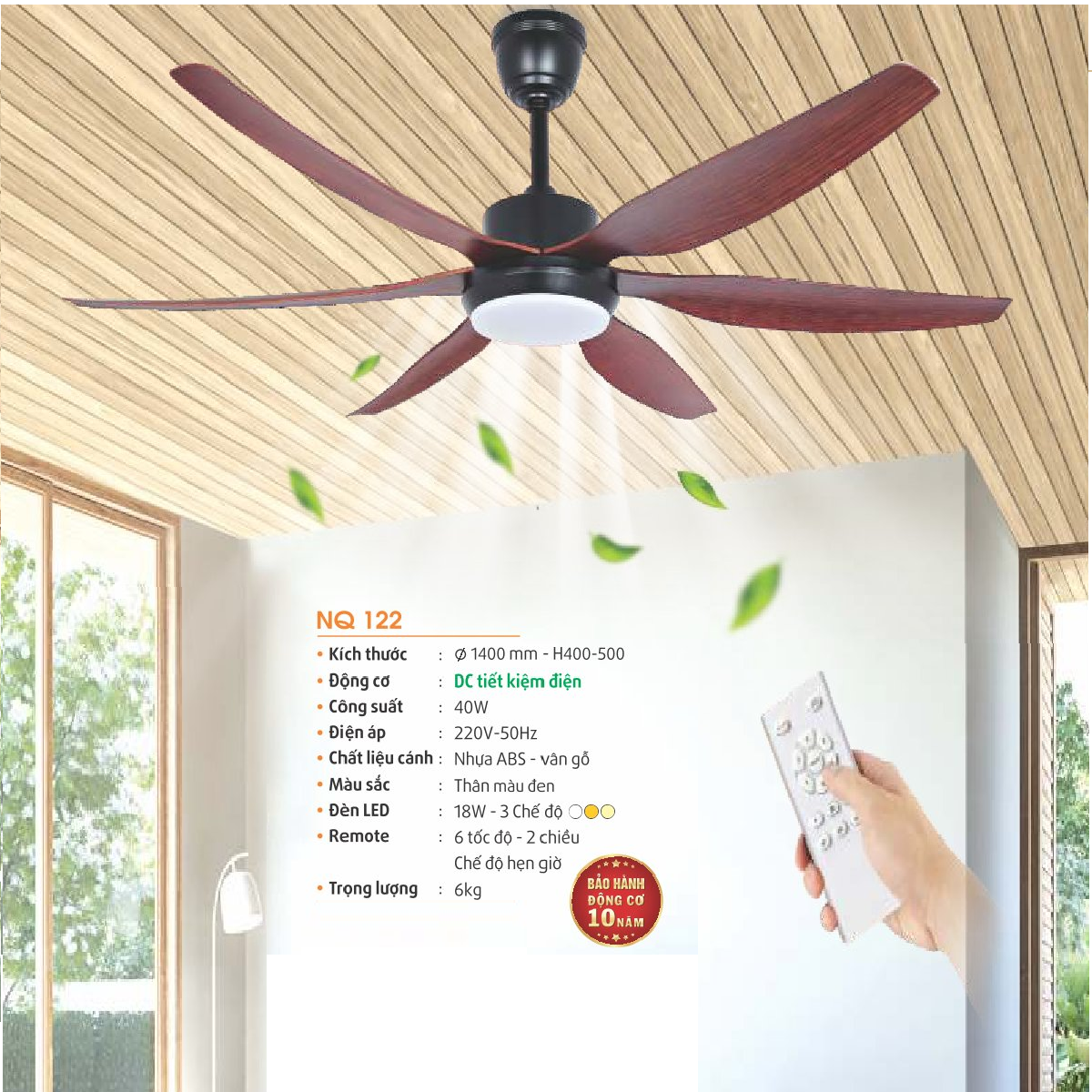 • Sản phẩm: NQ 122: Quạt trần đèn LED 6 cánh - KT: Ø1400mm x H400mm + 500mm - Đèn LED