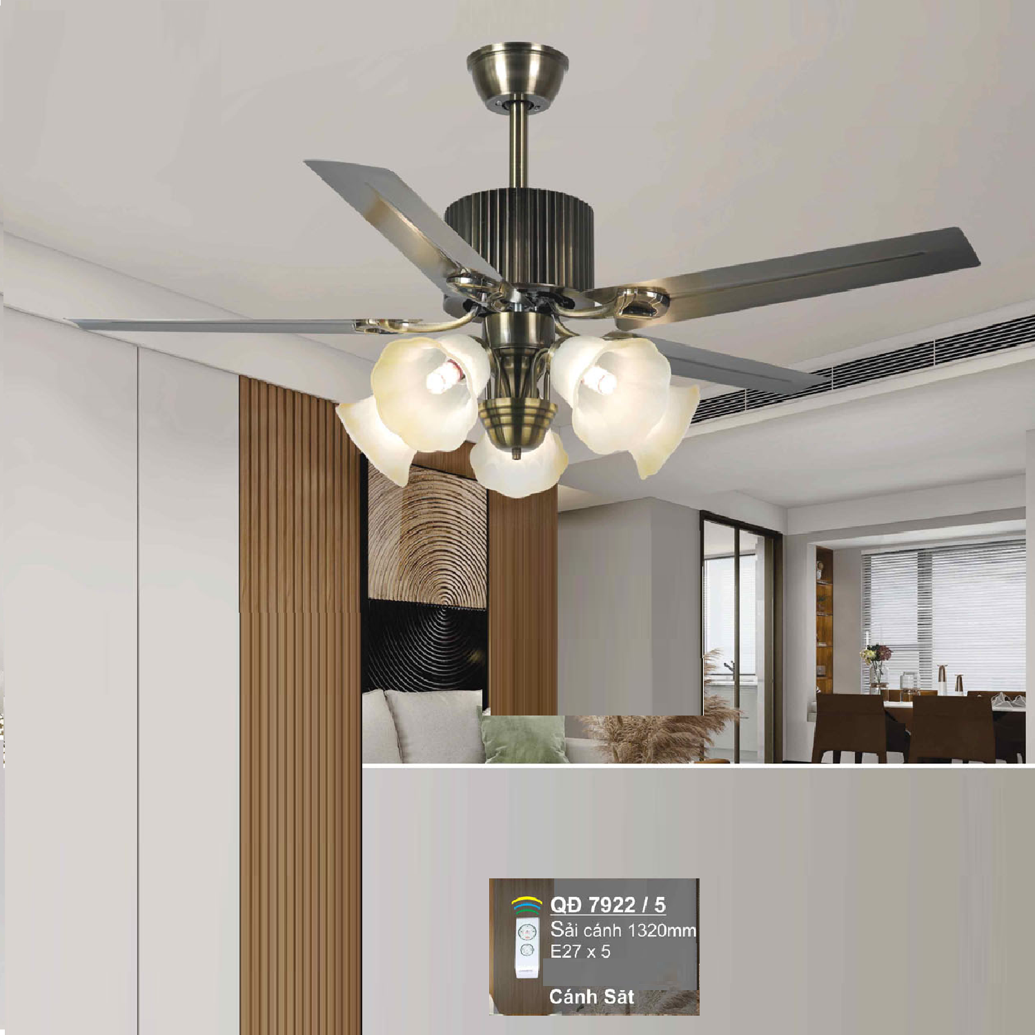 - Sản phẩm: QD 7922/5: Quạt trần đèn 5 cánh sắt, chao đèn thủy tinh