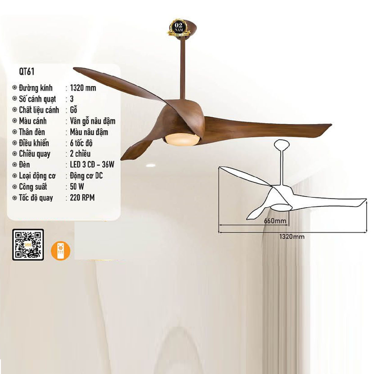 - Sản phẩm: QT61: Quạt trần đèn 3 cánh gỗ