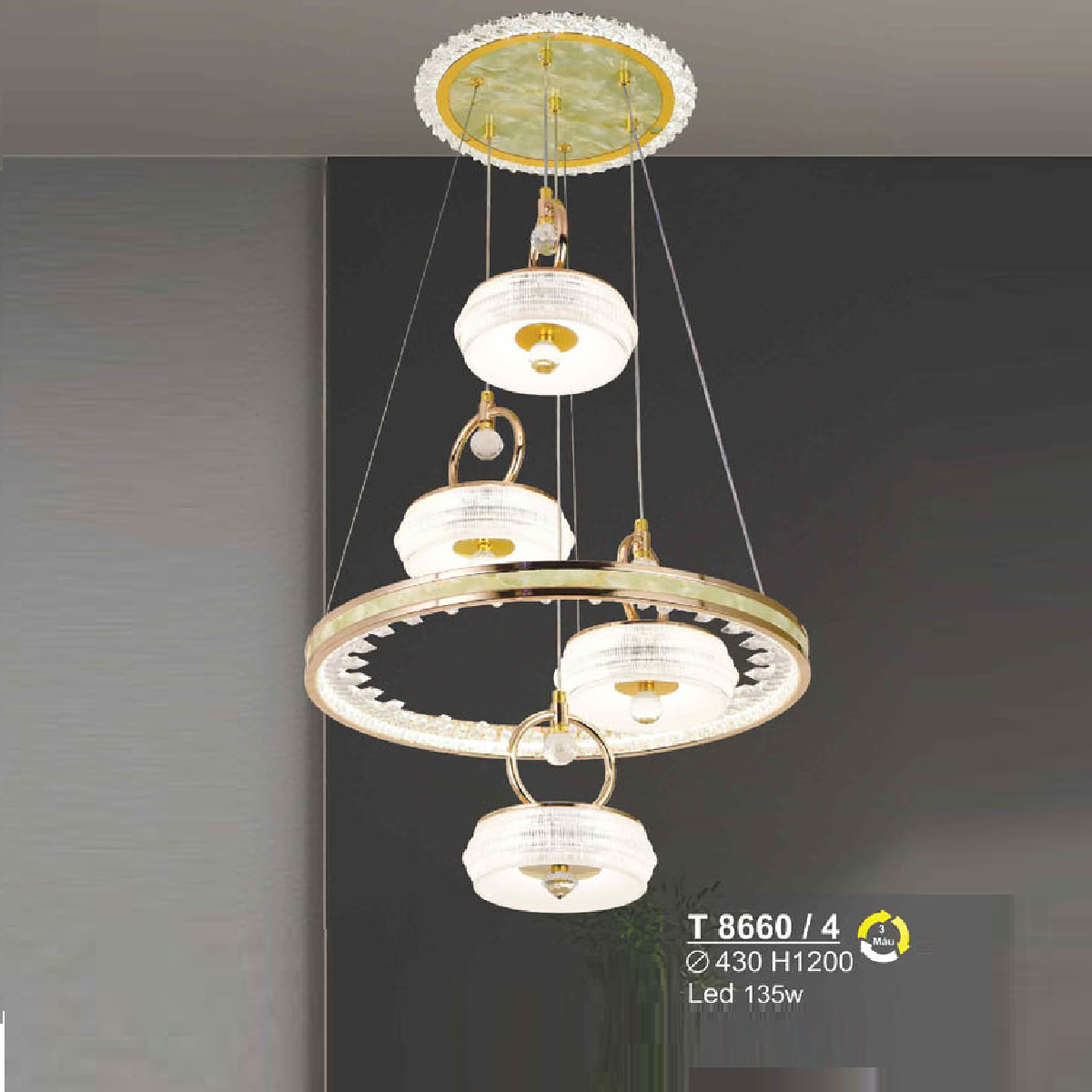 - Sản phẩm: T 8660/4: Đèn thả LED 4 bóng - KT: Ø430mm x H1200mm - Đèn LED 135W đổi 3 màu