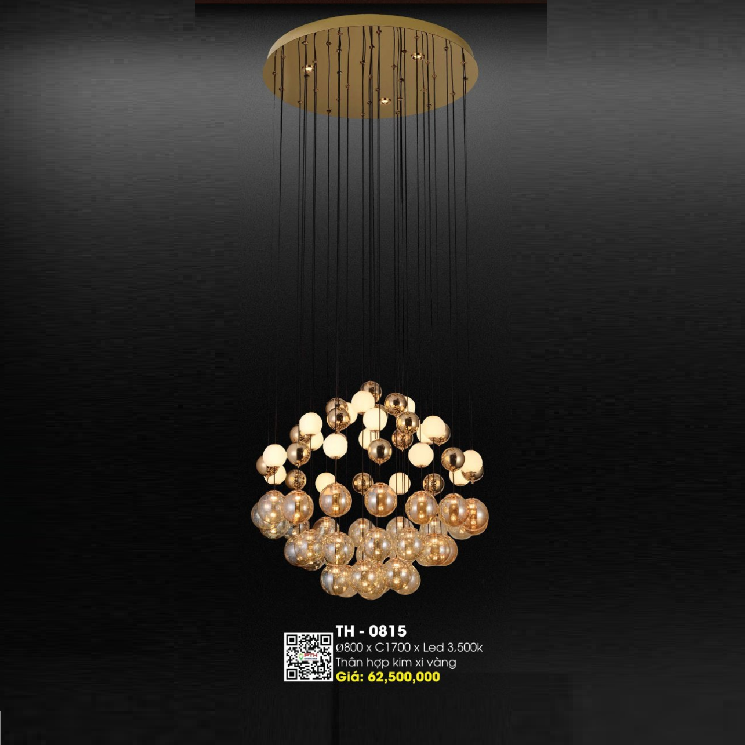 • Sản phẩm: TH - 0815: Đèn thả LED chao quả bi - KT: Ø800mm x H1700mm - Bóng đèn LED ánh sáng vàng 3500K