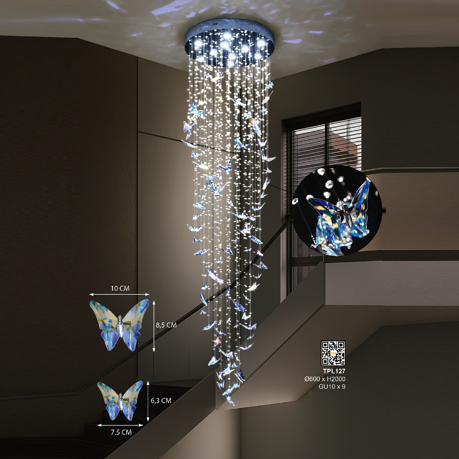 - Sản phẩm: TPL127: Đèn thả thông tầng Phale LED - KT: Ø600mm x H2000mm - Bóng đèn LED GU10 x 9 bóng