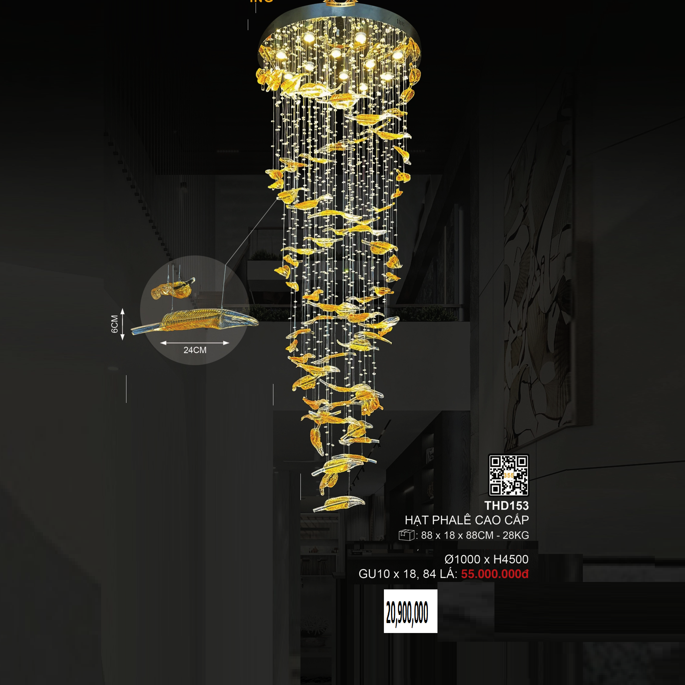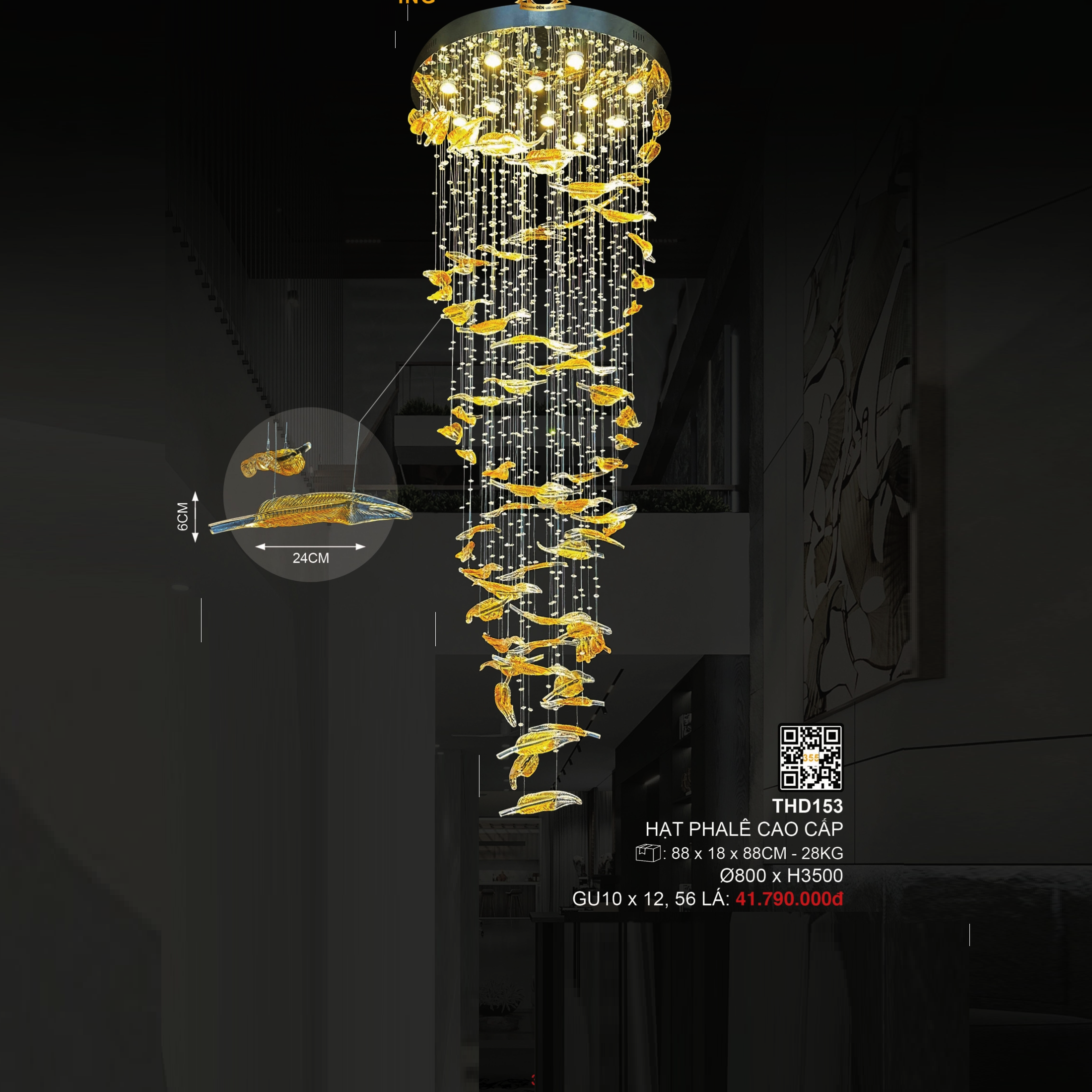 - Sản phẩm: 3 - THD153: Đèn thả thông tầng LED Phale - KT: Ø800mm x H3500mm - Đèn LED GU 10 x 12 bóng