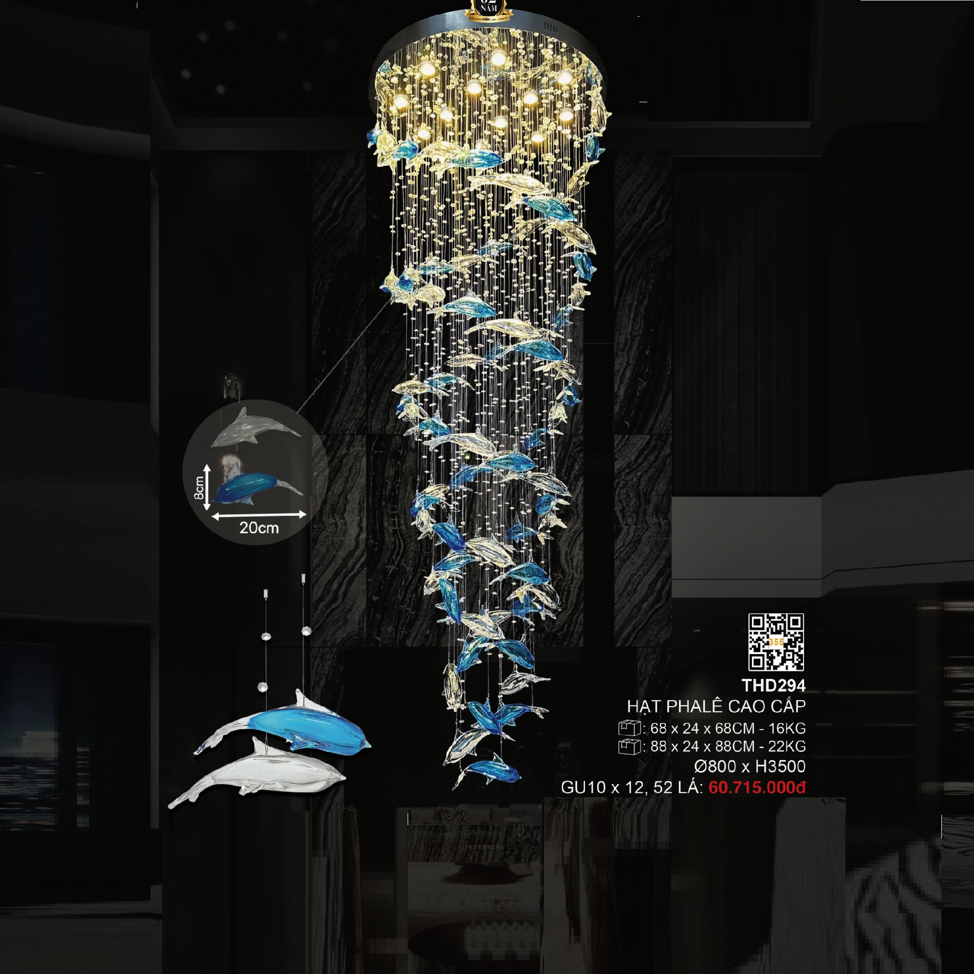 - Sản phẩm: 3- TPL294: Đèn thả thông tầng Phale LED - KT: Ø800mm x H3500mm - Đèn LED GU10 x 12 bóng