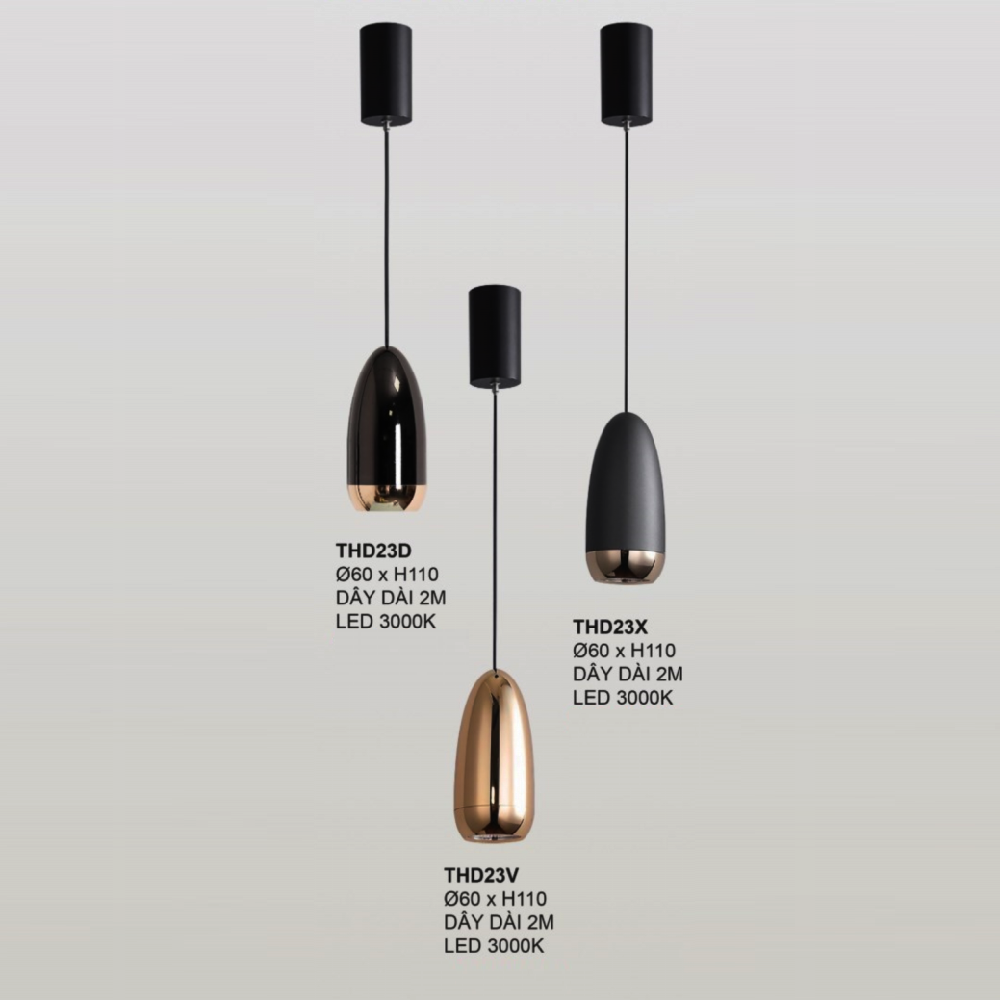 THD23D: Đèn thả đơn LED ( chao màu vàng/xám/đen) - KT: Ø60mm x H110mm ( Dây treo dài 2M)- Đèn LED ánh sáng vàng 3000K