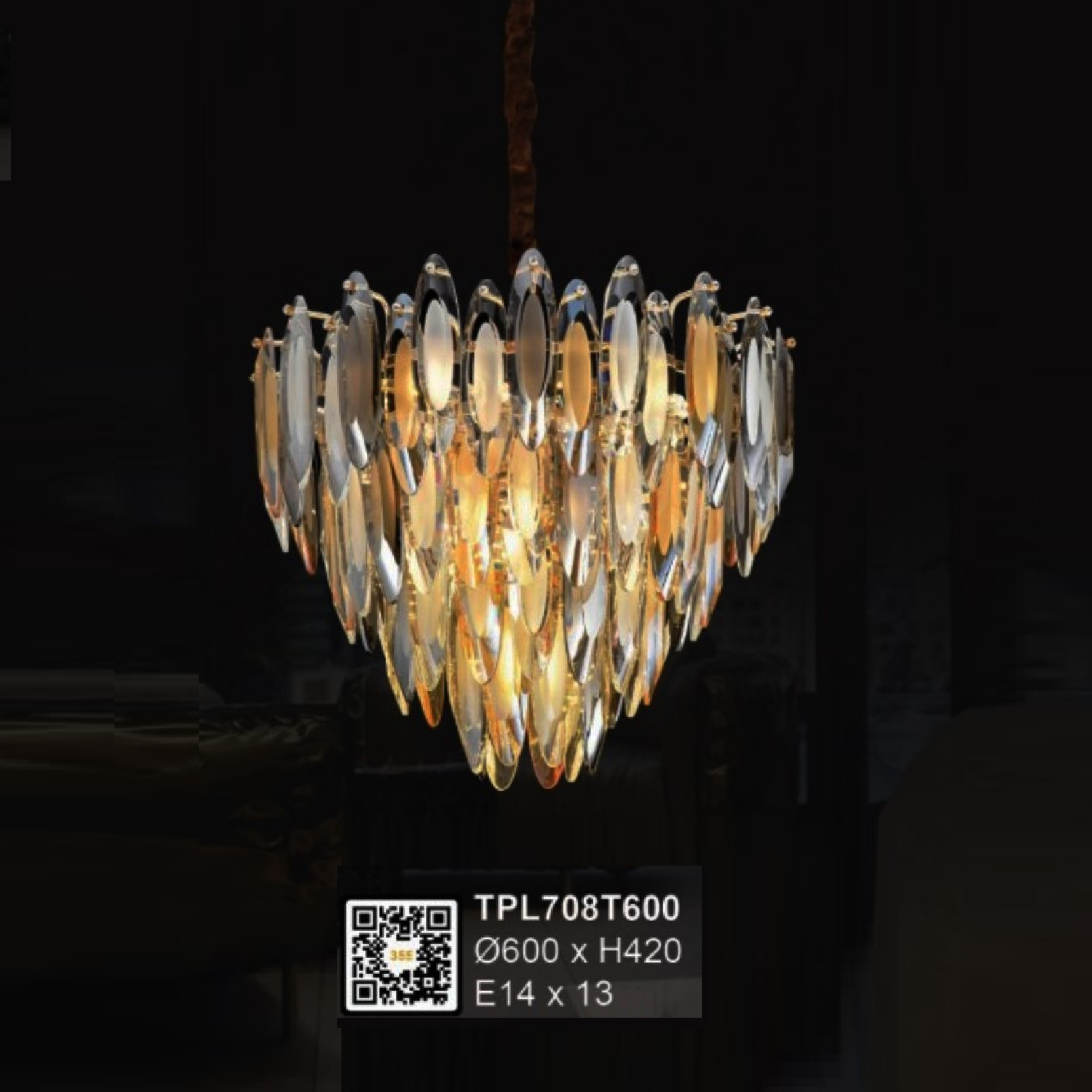 • Sản phẩm: 35 - TPL708T600: Đèn thả Phale - KT: Ø600mm x H420mm - Đèn E14 x 13 bóng