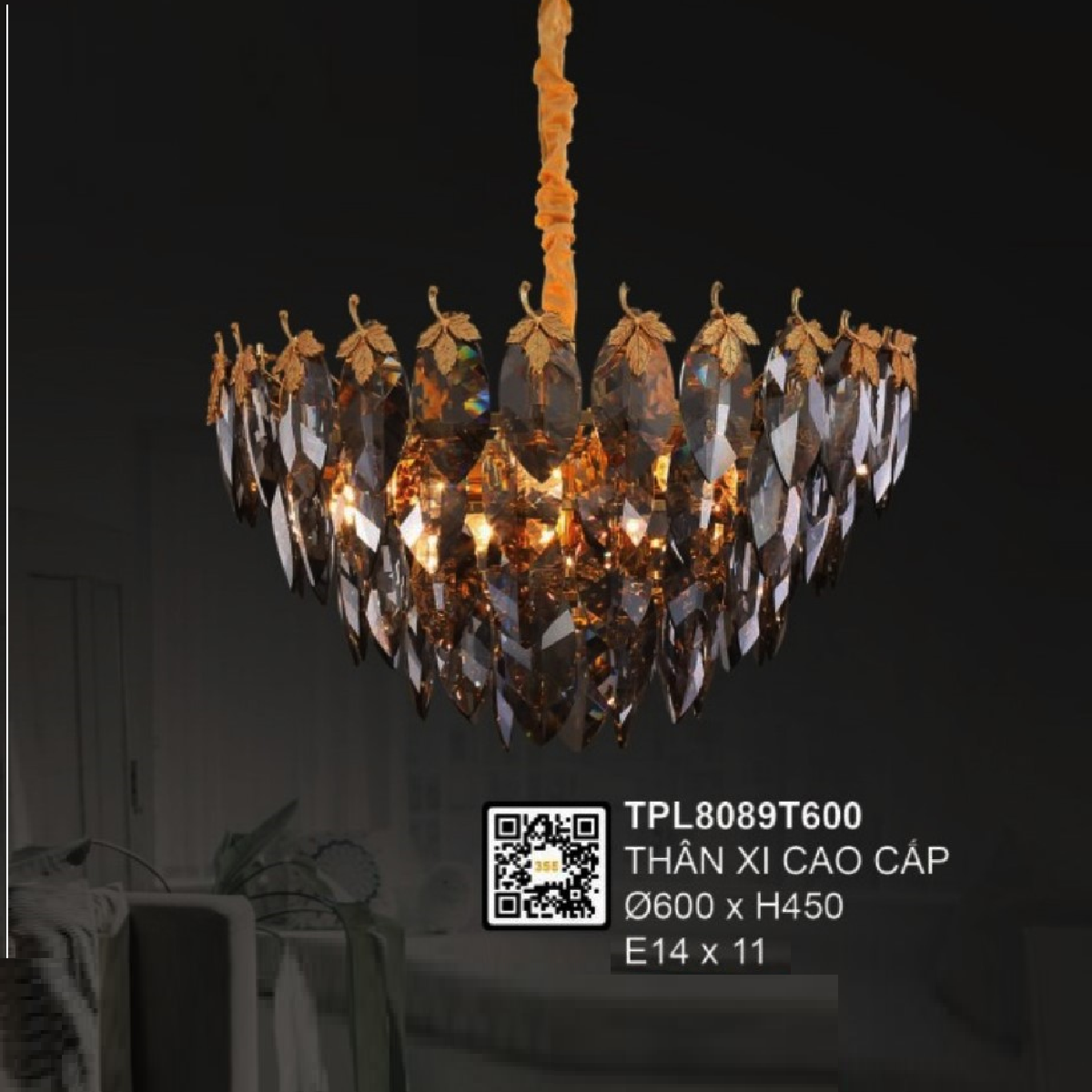 - Sản phẩm: 35 - TPL8089T600; Đèn thả Phale - KT: Ø600mm x H450mm - Đèn E14 x 11 bóng