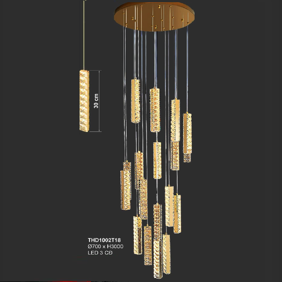 - Sản phẩm: 35 -THD1002T18: Đèn thả dây thanh thuỷ tinh - KT: Ø700mm x H3000mm - Đèn LED đổi 3 màu