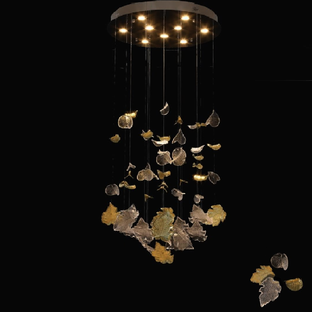 • Sản phẩm: 35 - THD9912: Đèn thả thông tầng lá phale - KT: Ø700mm x H2500mm - Bóng đèn LED GU10 x 9 bóng