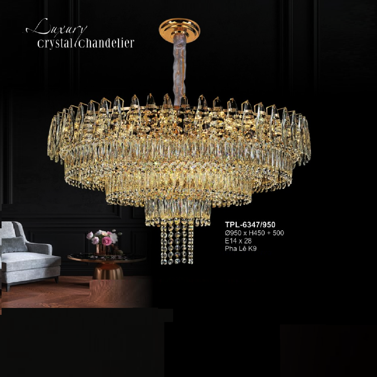5. A - TPL - 6347/950: Đèn thả Phale K9 - KT: Ø950mm x H450mm +500mm - Bóng đèn E14 x 28 bóng