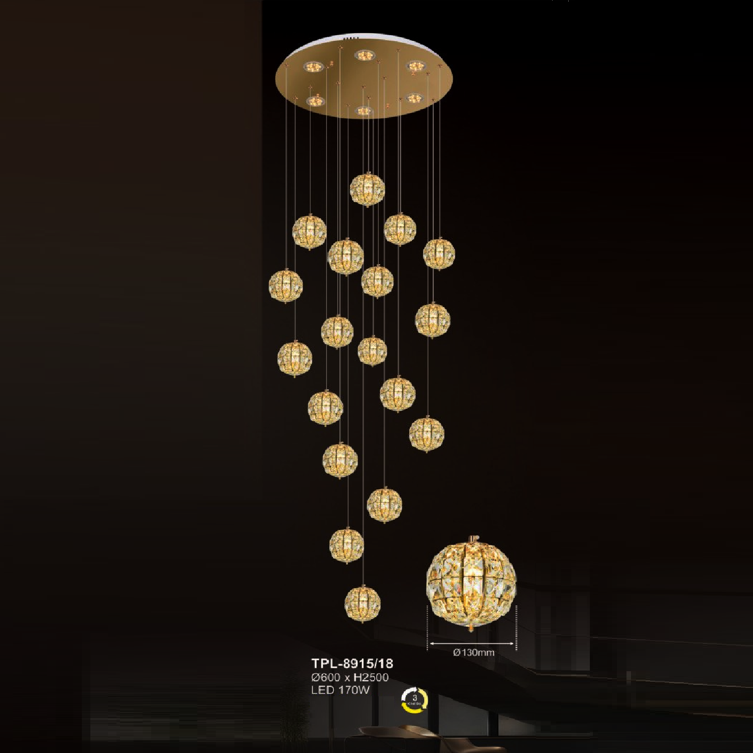• Sản phẩm: A - TPL - 8915/18: Đèn thả thông tầng LED - KT: Ø600mm x H2500mm - Đèn LED 170W đổi 3 màu