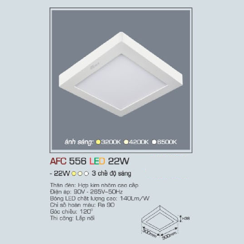 • Sản phẩm: AFC 556 LED 22W: Đèn LED vuông ốp nổi 22W, 1 chế độ ánh sáng (vàng/trung tính/trắng)