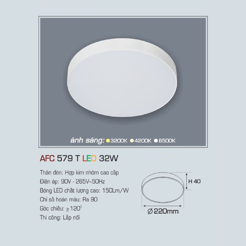 • Sản phẩm: AFC 579T LED 32W: Đèn LED tràn viền ốp nổi 32W, 1 chế độ ánh sáng (vàng/trung tính/trắng)