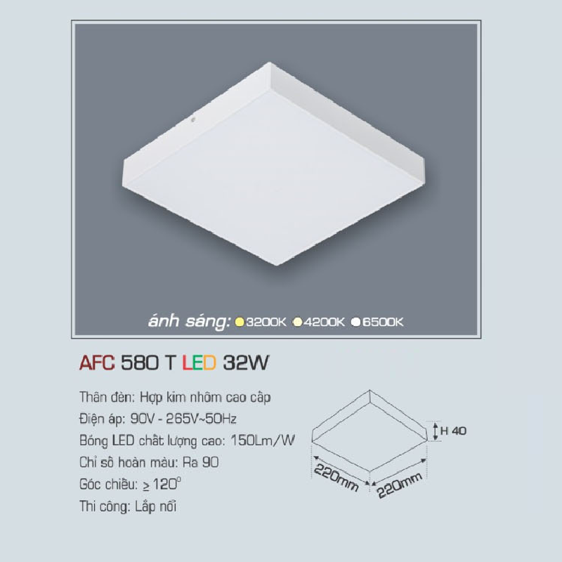 • Sản phẩm: AFC 580T LED 32W: Đèn LED vuông tràn viền gắn nổi 32W, 1 chế độ ánh sáng (vàng/trung tính/trắng)