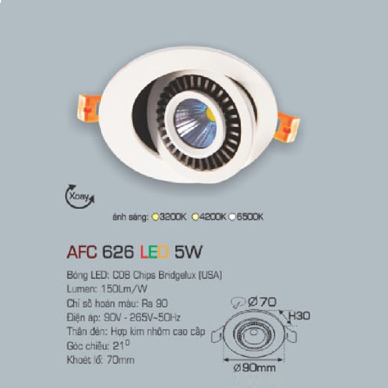 - Sản phẩm: AFC 626 LED 5W: Đèn LED âm trần chiếu điểm xoay góc 5W 1 chế độ ánh sáng (vàng/trung tính/trắng)