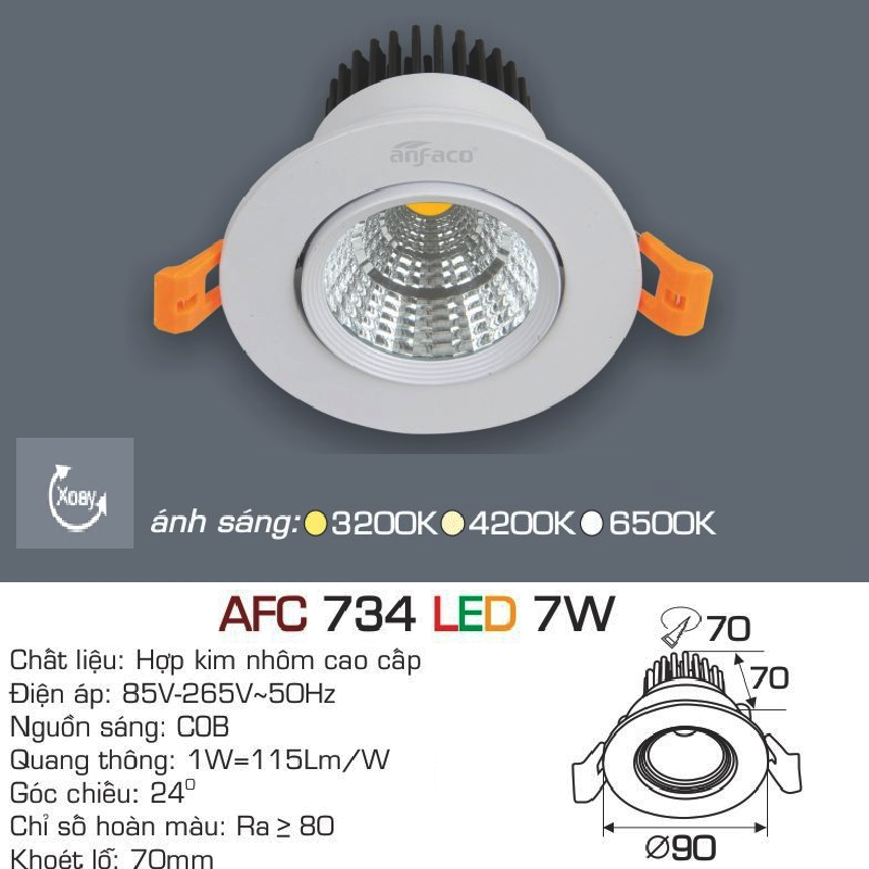 4. AFC 734 LED 7W: Đèn LED âm trần chiếu điểm 7W - KT: Ø90mm x H70mm - Lổ khoét: Ø70mm - Ánh sáng vàng/trung tính/trắng