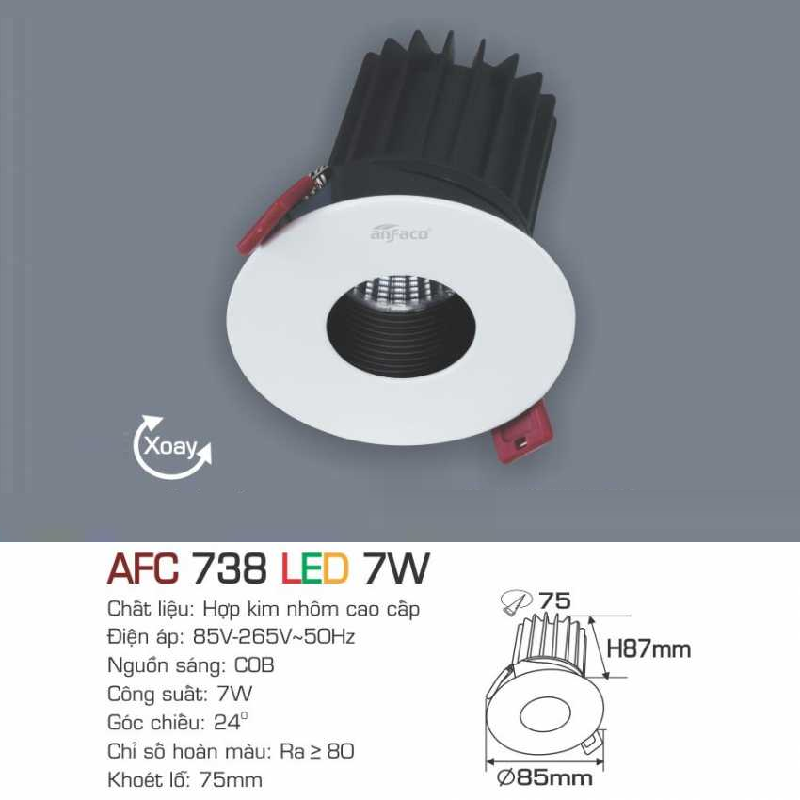 AFC 738 LED 7W: Đèn LED chiếu điểm 7W - KT: Ø85mm x H85mm - Lổ khoét: Ø75mm - Ánh sáng vàng/trắng/trung tính