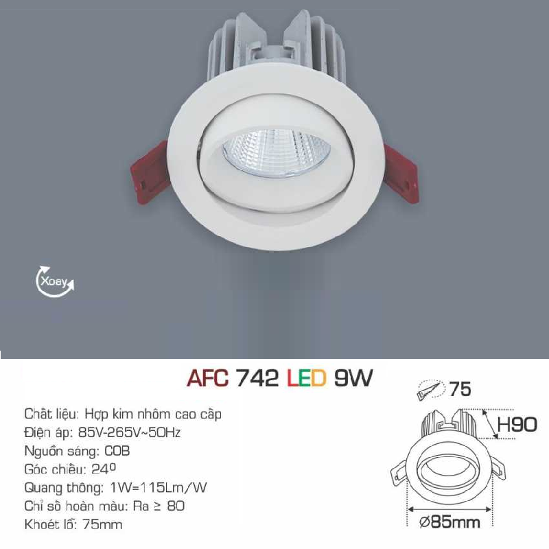 AFC 742 LED 9W: Đèn LED chiếu điểm 9W - KT: Ø85mm x H90mm - Lổ khoét: Ø75mm - Ánh sáng vàng/trắng/trung tính
