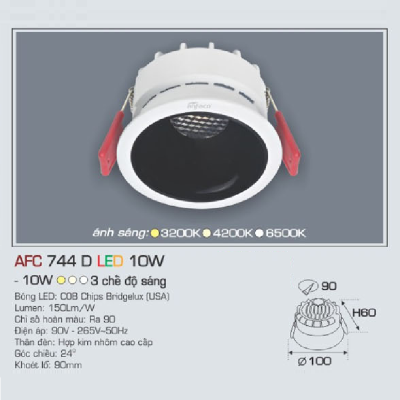 - Sản phẩm: AFC 744 D LED 10W: Đèn LED âm trần chiếu điểm 10W, 1 chế độ sáng ( vàng/trung tính/trắng)