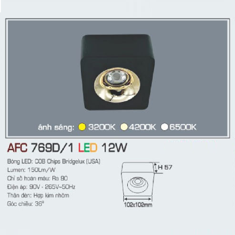 - Sản phẩm: AFC 769D/1 LED 12W: Đèn LED chiếu điểm gắn nổi 12W, 1 chế độ ánh sáng (vàng/trung tính/trắng)