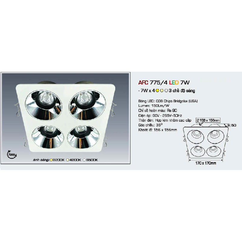 AFC 775/4 LED 7W: Đèn LED âm trần chiếu điểm 7W x4 - KT: 170 x 170mm x  H50mm - Lổ khoét: 156mm x 156mm - Ánh sáng vàng/trung tính/trắng