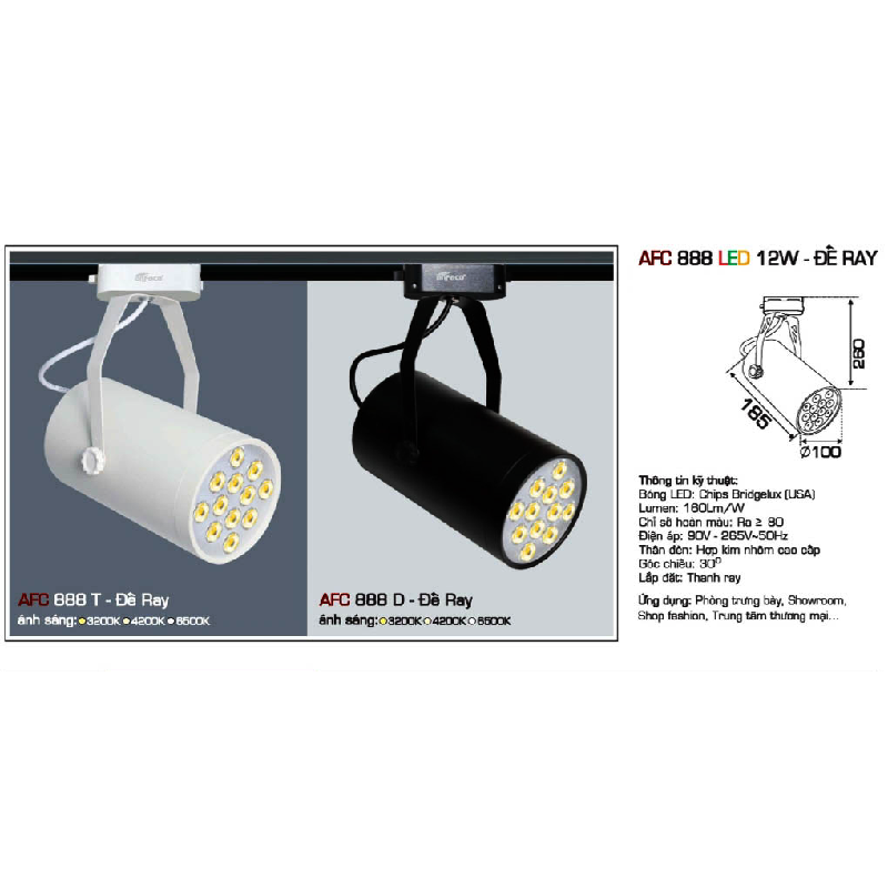 AFC 888 LED 12W : Đèn LED rọi ray chiếu điểm 12W ( vỏ trắng/vỏ đen) - KT: Ø100mm x 185mm x H260mm - Ánh sáng vàng/trung tính/trắng