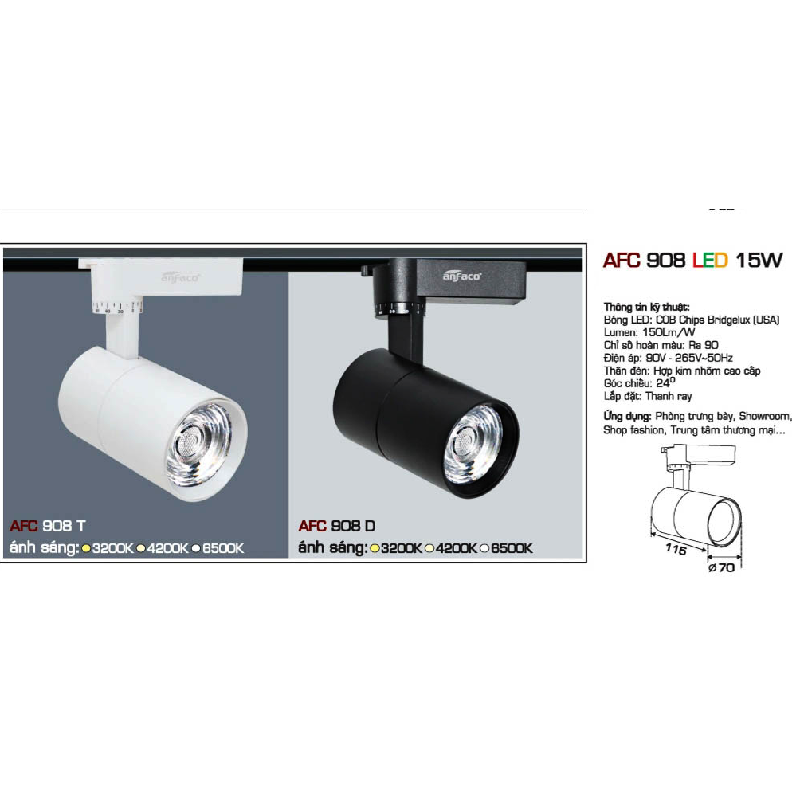 - Sản phẩm: AFC 908 LED 15W : Đèn LED rọi ray chiếu điểm 15W ( vỏ trắng/vỏ đen) - KT: Ø70mm x 115mm - Ánh sáng vàng/trung tính/trắng