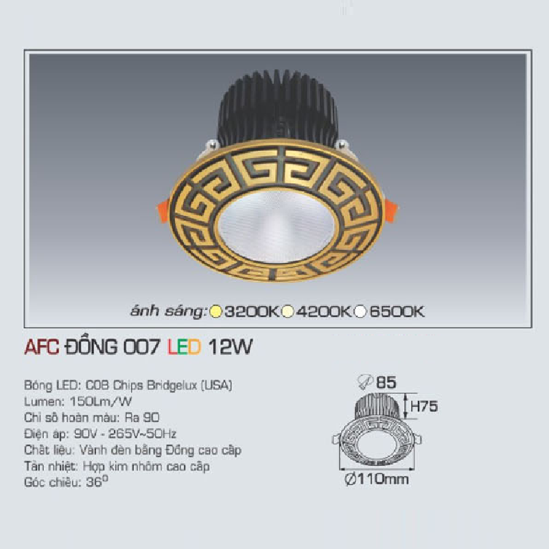 - Sản phẩm: AFC ĐỒNG 007 LED 12W: Đèn LED âm trần 12W, vành đèn bằng đồng, 1 chế độ ánh sáng ( vàng/trung tính/trắng)