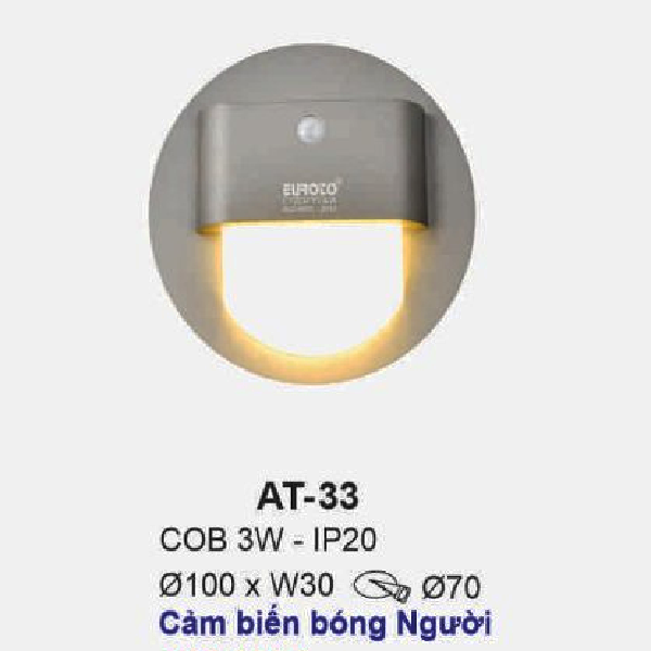 AT - 33: Đèn LED âm tường/âm bậc cầu thang Cảm biến bóng người - IP 20 - KT: Ø100mm x W30mm - Lổ khoét: Ø70mm - Bóng đèn LED COB 3W