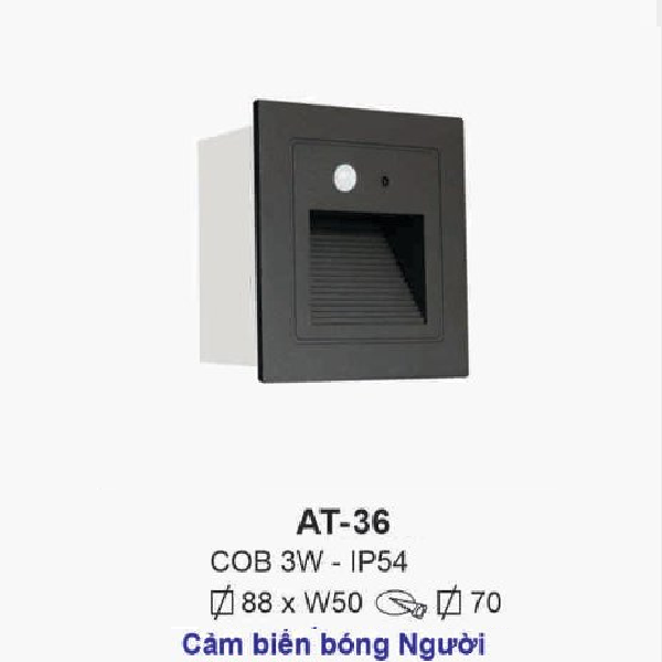 AT - 36: Đèn LED âm tường/âm bậc cầu thang, Cảm biến bóng người - IP 54 - KT: V88mm x W50mm - Lổ khoét: V70mm - Bóng đèn LED COB 3W