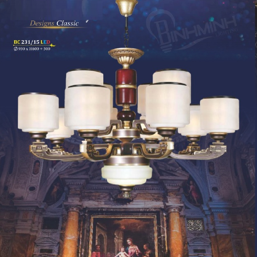 - Sản phẩm: BM - BC 231/15 LED: Đèn chùm 15 tay - KT: Ø950mm x H600mm + 500mm - Bóng đèn chân E27 x 15 bóng + Đèn LED