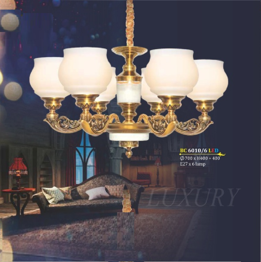 - Sản phẩm: BM - BC 6010/6 LED: Đèn chùm 6 tay - KT: Ø700mm x H400mm + 500mm - Bóng đèn chân E27 x 6 bóng + Đèn LED