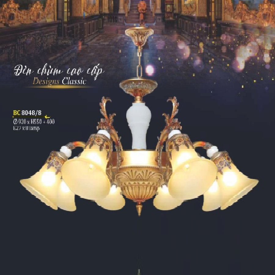 • Sản phẩm: BM - BC 8048/8: Đèn chùm 8 tay - KT: Ø920mm x H550mm + 400mm - Bóng đèn chân E27 x 8 bóng