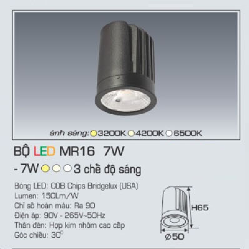 • Sản phẩm: Bộ LED MR16 7W, 1 chế độ ánh sáng ( vàng /trung tính/trắng)