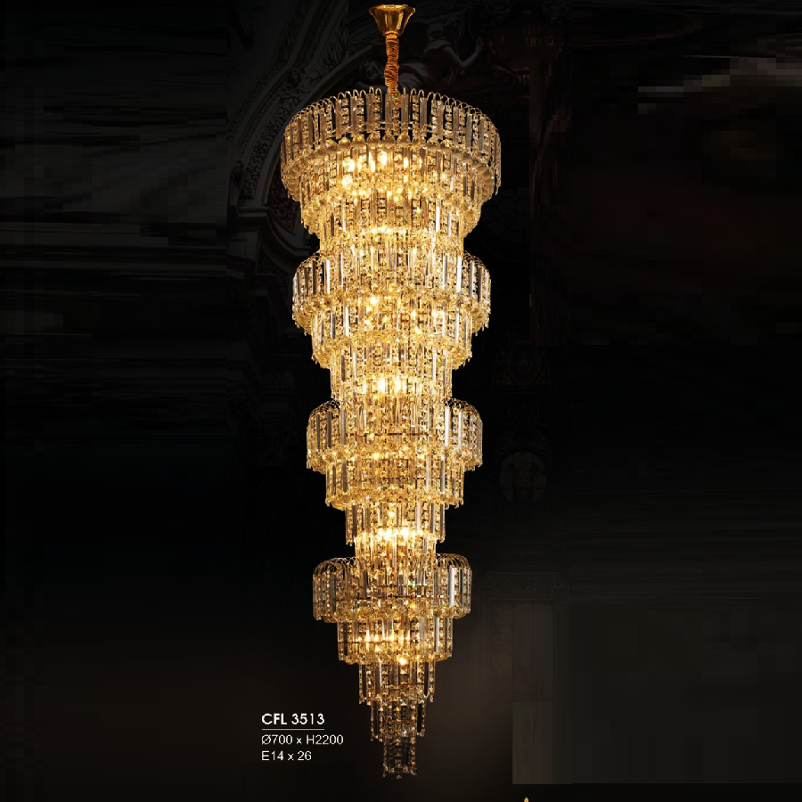 - Sản phẩm: HF - CFL 3513: Đèn thả Phale - KT: Ø700mm x H2200mm - Đèn E14 x 26 bóng