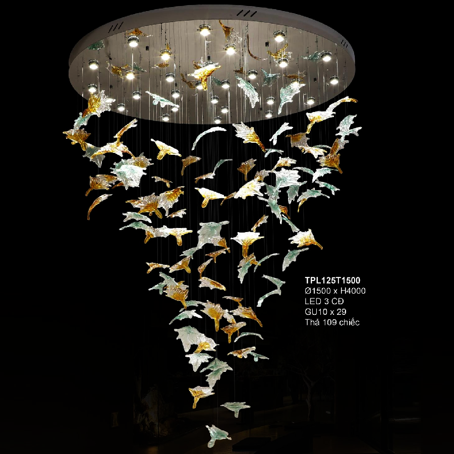 • ĐẶC ĐIỂM           : Khung, đế đèn bằng hợp kim; Thân đèn dây cáp treo 109 chiếc lá Phale màu