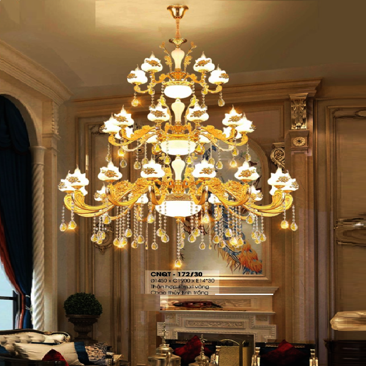 • Sản phẩm: CNQT - 172/30: Đèn chùm nến chao thủy tinh khảm hoa văn 30 tay - KT: Ø1450mm x H1900mm - Bóng đèn E14 x 30 bóng