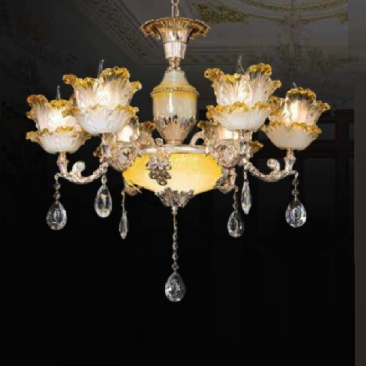 • Sản phẩm: CNQT - 240: Đèn chùm nến 6 tay, chao thủy tinh - KT: Ø600mm x H900mm - Bóng đèn nến E14 x 6 bóng