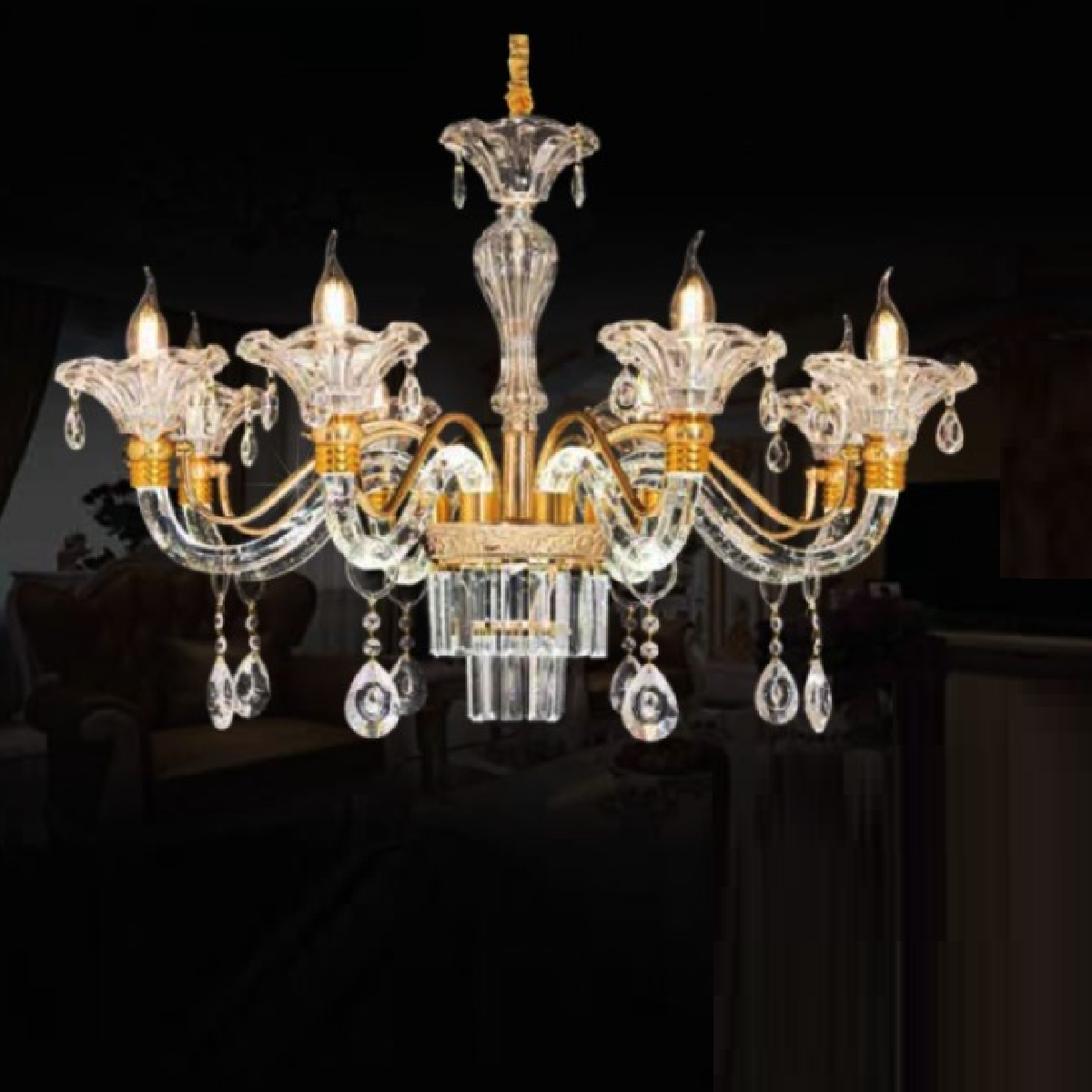 5. CNQT - 277: Đèn chùm nến 8 tay, chao thủy tinh - KT: Ø800mm x H900mm - Bóng đèn nến E14 x 8 bóng