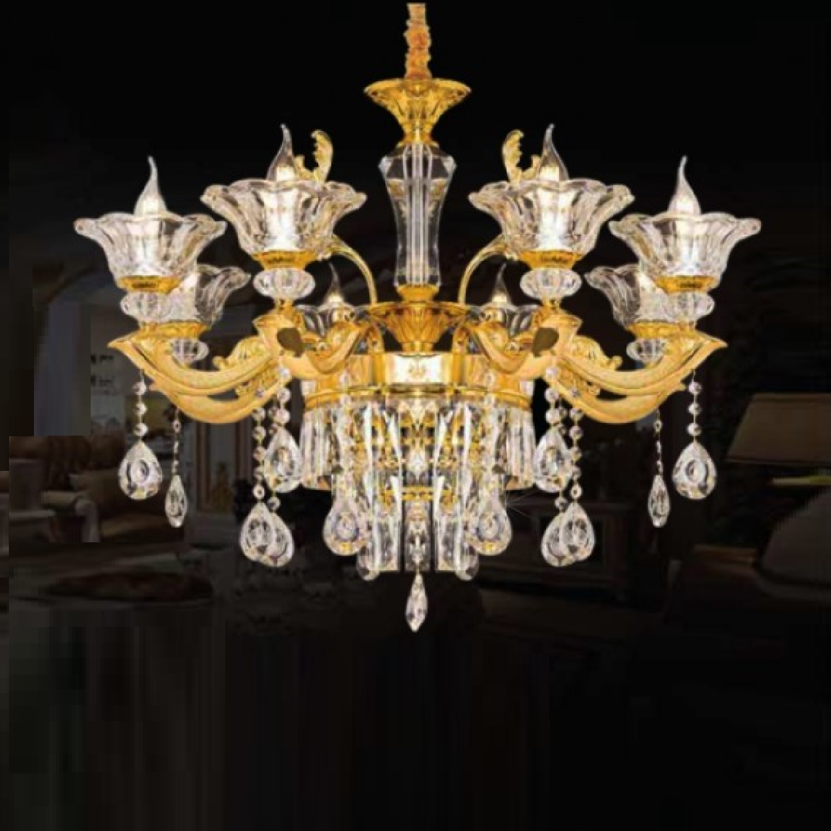 - Sản phẩm: CNQT - 280: Đèn chùm nến 8 tay, chao thủy tinh - KT: Ø750mm x H950mm - Bóng đèn nến E14 x 8 bóng