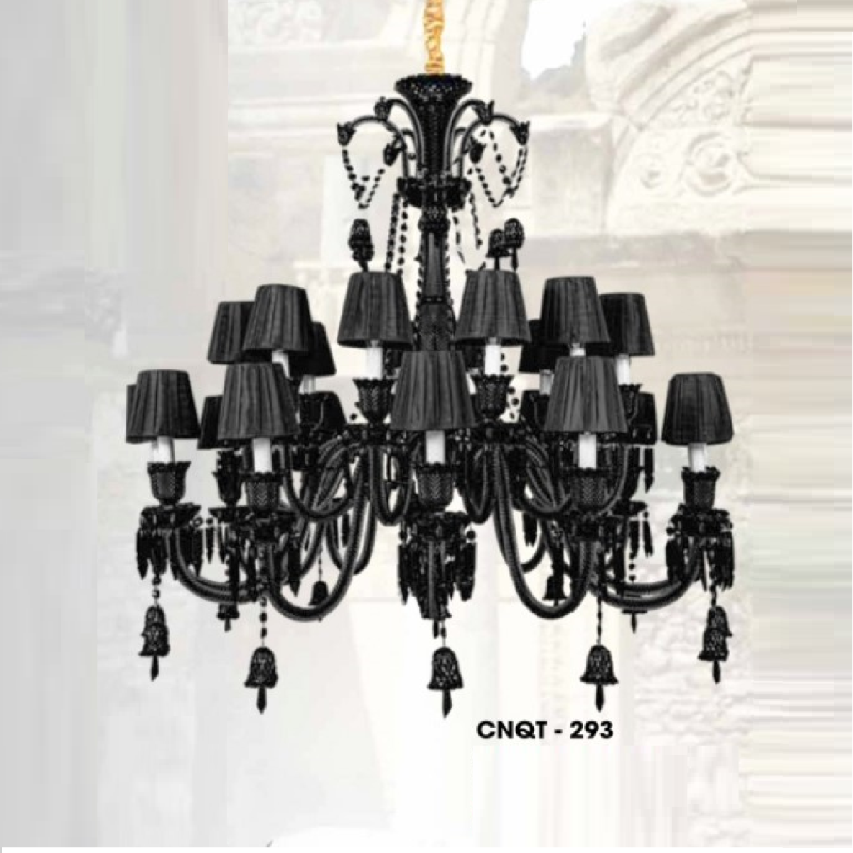 - Sản phẩm: CNQT - 293: Đèn chùm Phale đen cao cấp 24 tay, chụp dù - KT: Ø1100mm x H1450mm - Bóng đèn nến chân E14 x 24 bóng