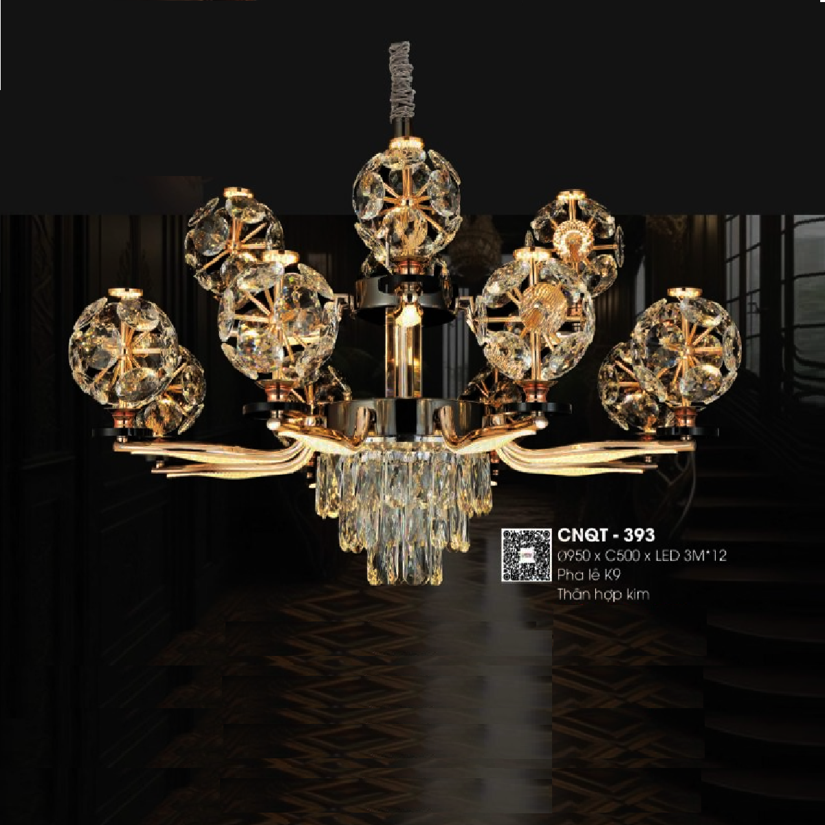 - Sản phẩm: CNQT - 393: Đèn chùm LED Phale K9 12 tay - KT: Ø950mm x H500mm - Bóng đèn LED 3M x 12