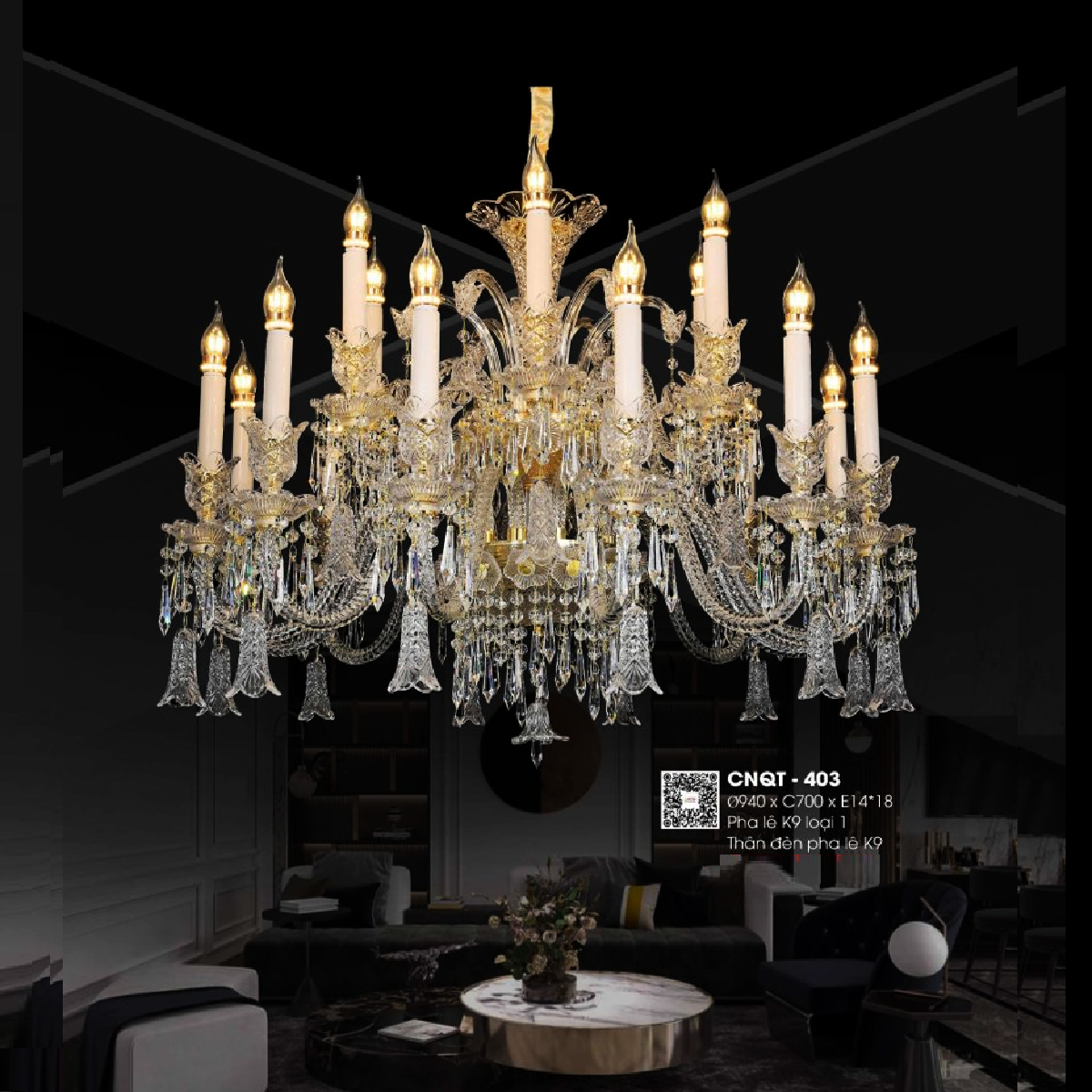 - Sản phẩm: CNQT - 403: Đèn chùm Phale nến 18 tay - KT: Ø940mm x H700mm - Bóng đèn E14 x 18 bóng