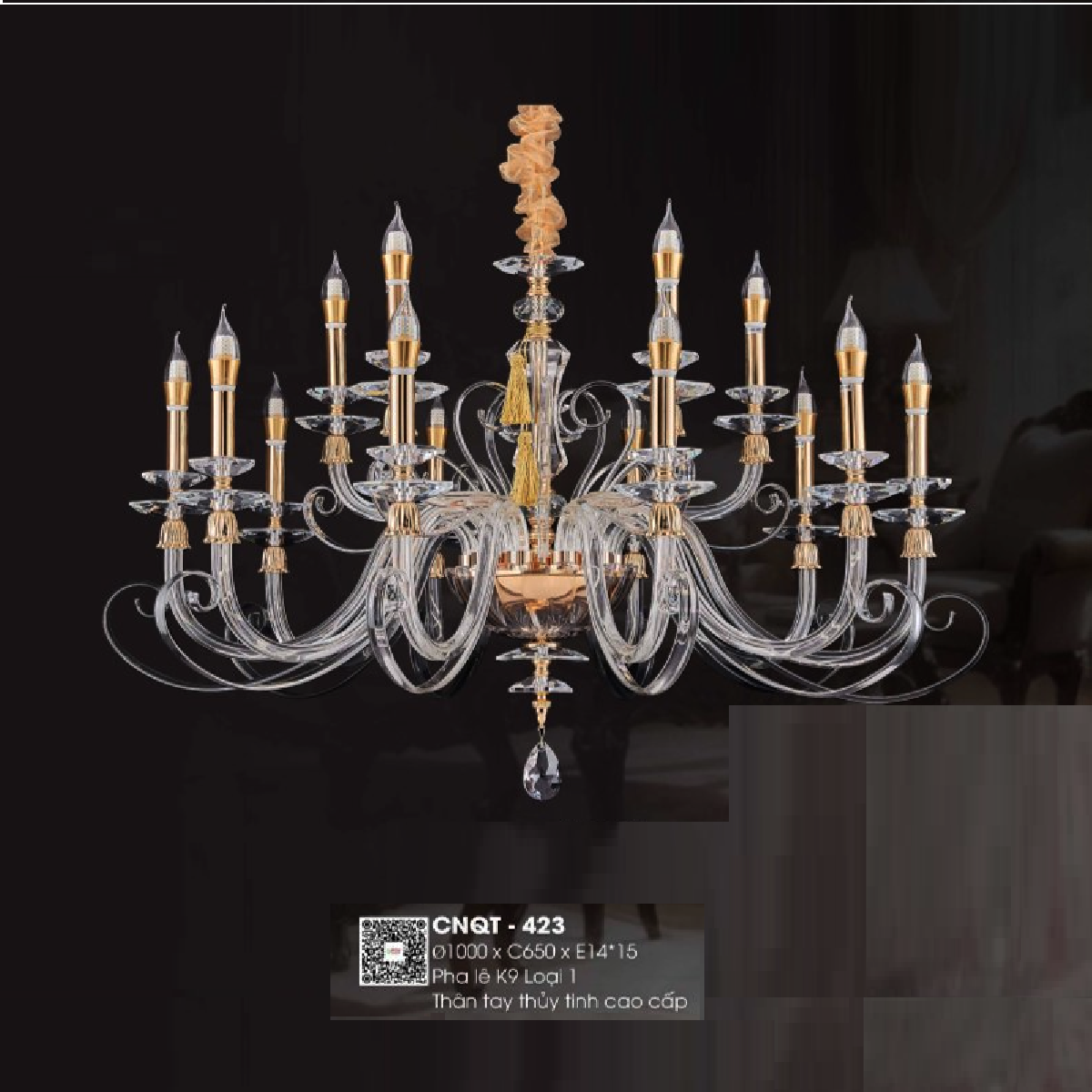 - Sản phẩm: CNQT - 423: Đèn chùm Phale nến 18 tay - KT: Ø1000mm x H650mm - Bóng đèn E14 x 15 bóng