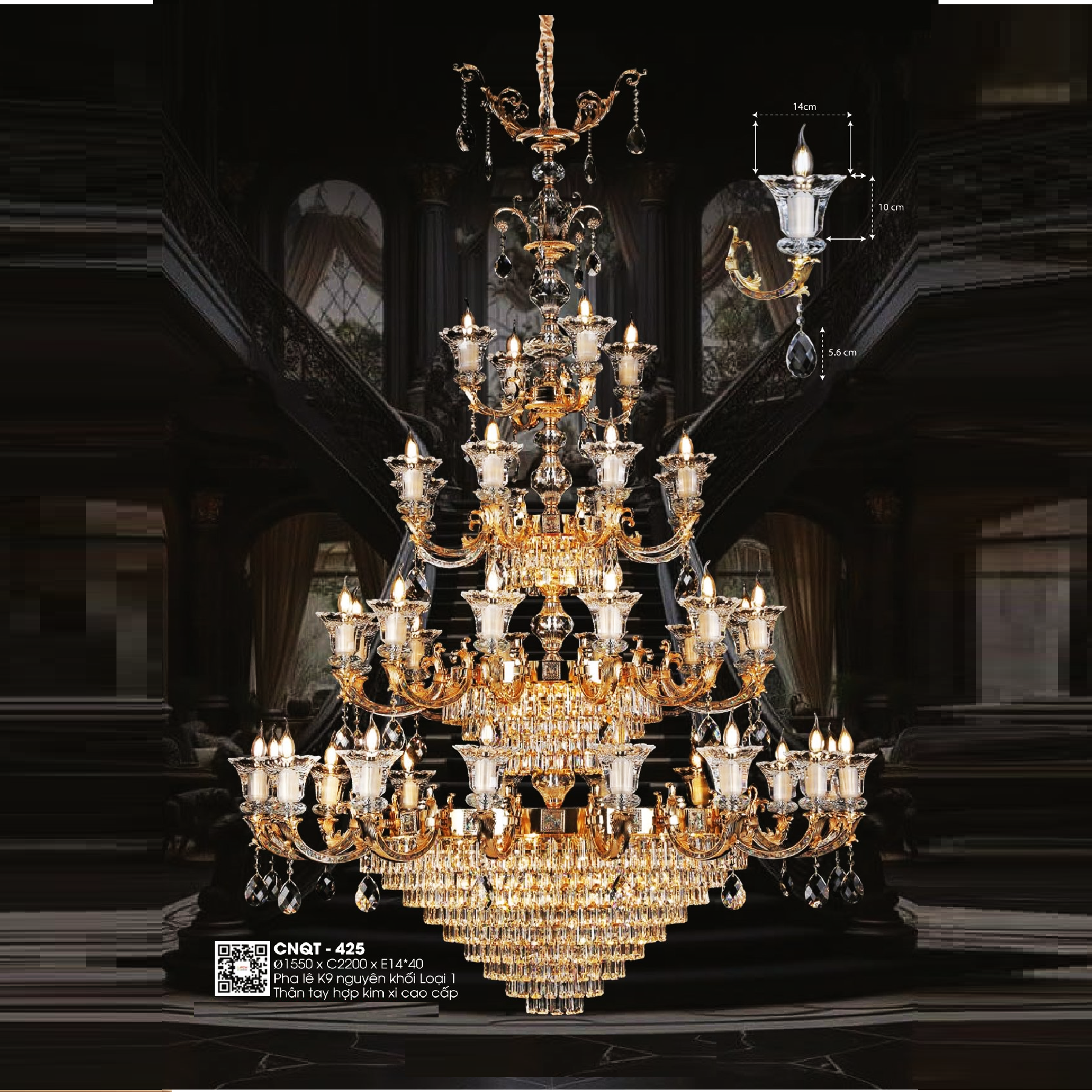 - Sản phẩm: CNQT - 425: Đèn chùm nến 40 tay - KT: Ø1550mm x H2200mm - Bóng đèn E14 x 40 bóng