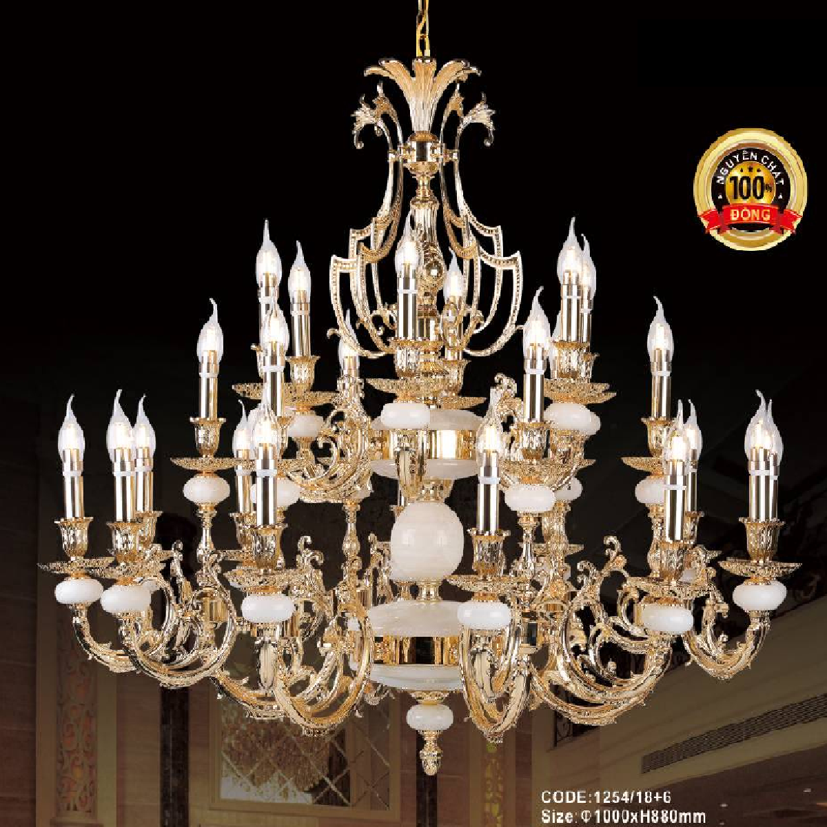 • Sản phẩm: CODE:1254/18+6: Đèn chùm đồng 24 tay, chao đá màu vàng - KT: Ø 1000mm x H 880mm - Bóng đèn chân E 14 x 24 bóng