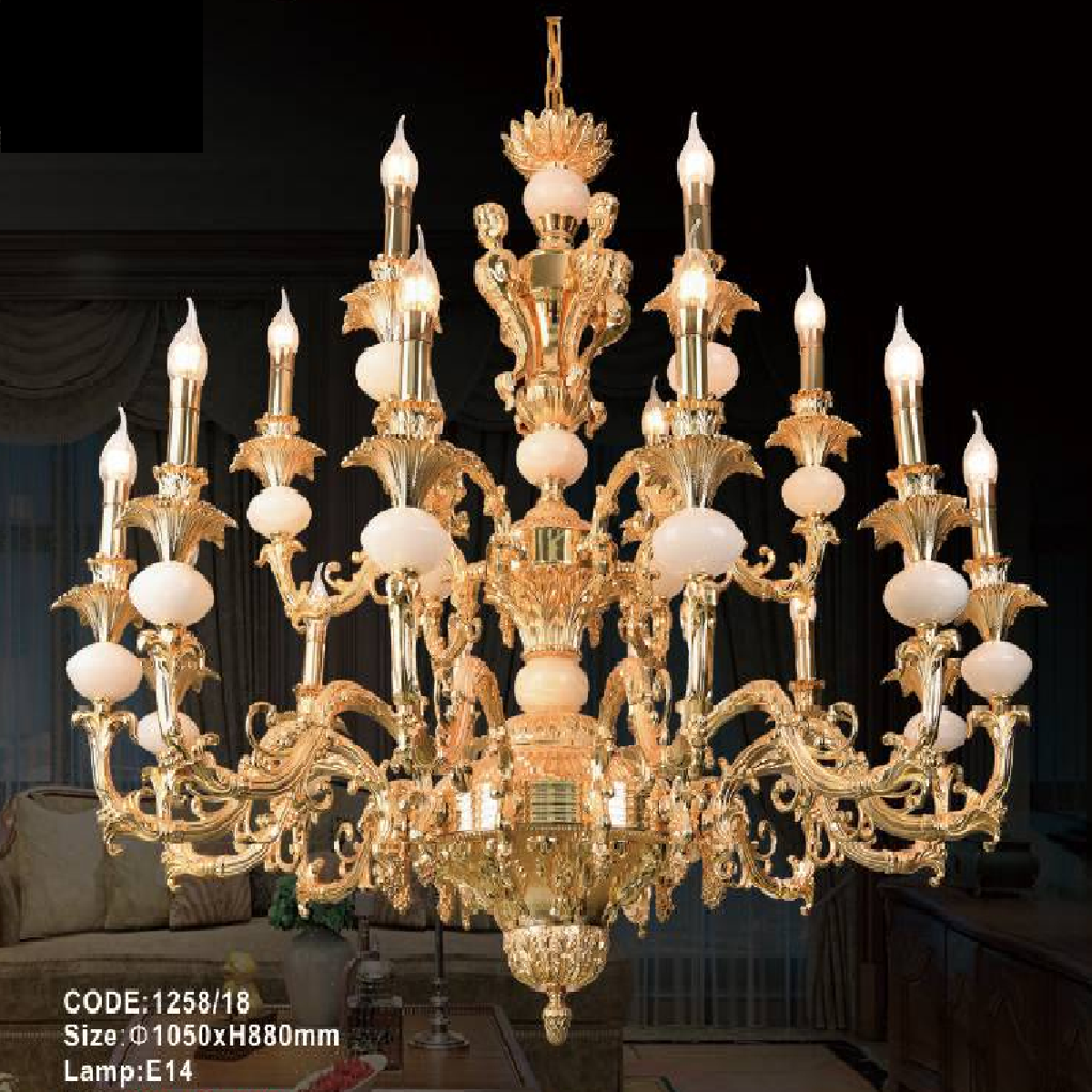 CODE:1258/18: Đèn Chùm đồng 18 tay, đá trắng - KT: Ø1050mm x H880mm - Bóng đèn chân E14 x 18 bóng