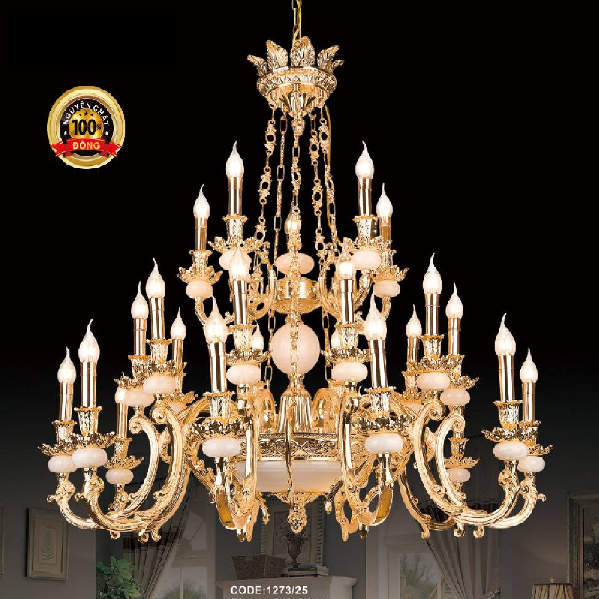 • Sản phẩm: CODE:1273/25: Đèn chùm đồng 25 tay, đá vàng - KT: Ø 1050mm x H 950mm - Bóng đèn chân E14 x 25 bóng