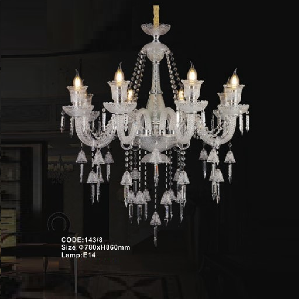 CODE: 143/8: Đèn chùm nến 8 tay - KT: Ø780mm x H860mm - Bóng đèn nến E14 x 8 bóng